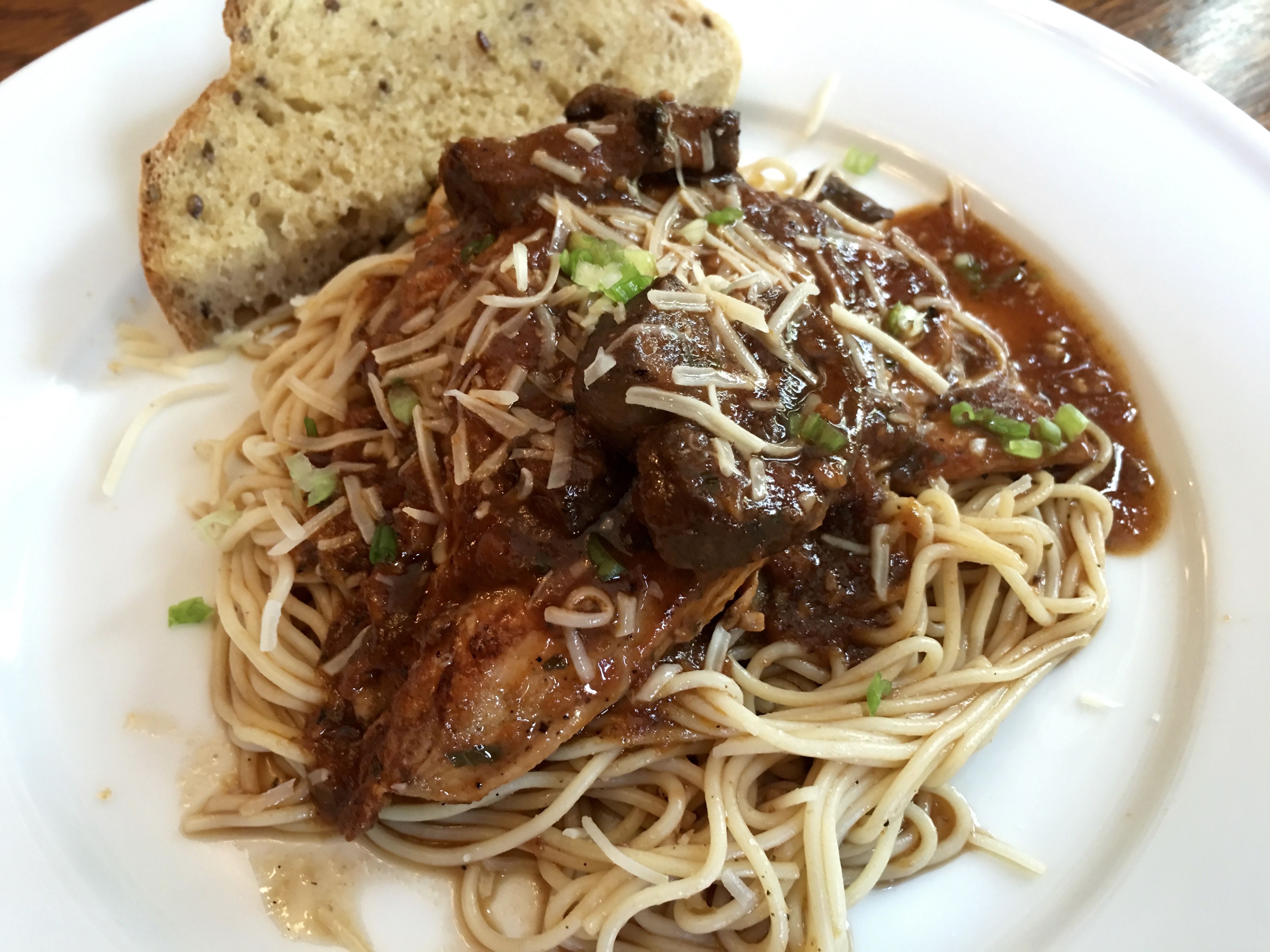 Chicken cacciatore on creamy polenta. Our chicken breast is pan-fried in butter with a crushed plum tomatoes, fresh mushrooms, and fresh red peppers sauce served on a bed of creamy rosemary polenta. S. Parkes Cadman observes, “We can see a thousand miracles around us every day. What is more supernatural than an egg yolk turning into a chicken?” Well, he’s right, but we’d suggest seeing what happens when take that miraculous chicken and turn it into chicken cacciatore. It’s nothing short of heavenly.